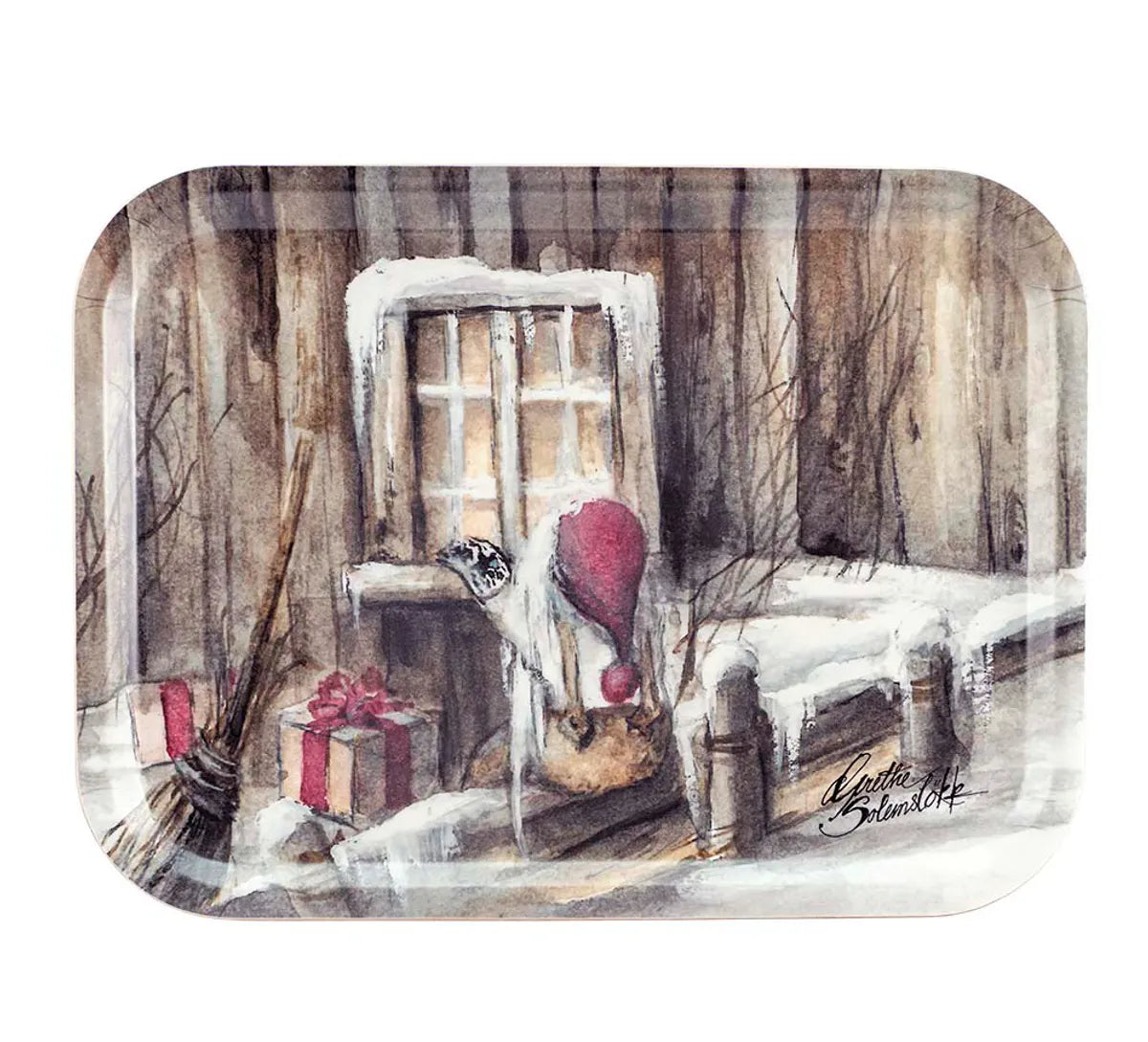 Et lett og praktisk brett i bjørkelaminat med Gammelnissen som titter inn fra juleserien Gammelnissen! Ypperlig til å ha frokosten på, organisere og samle ting på eller å brukes til pynt.
