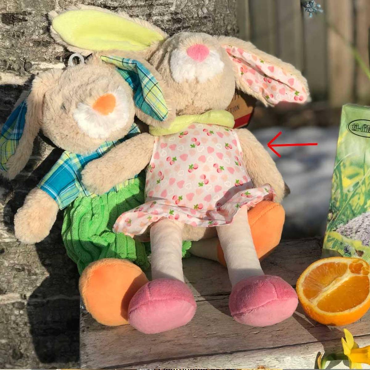 Koselig hare med rosa kjole, lange ører og dinglebein.