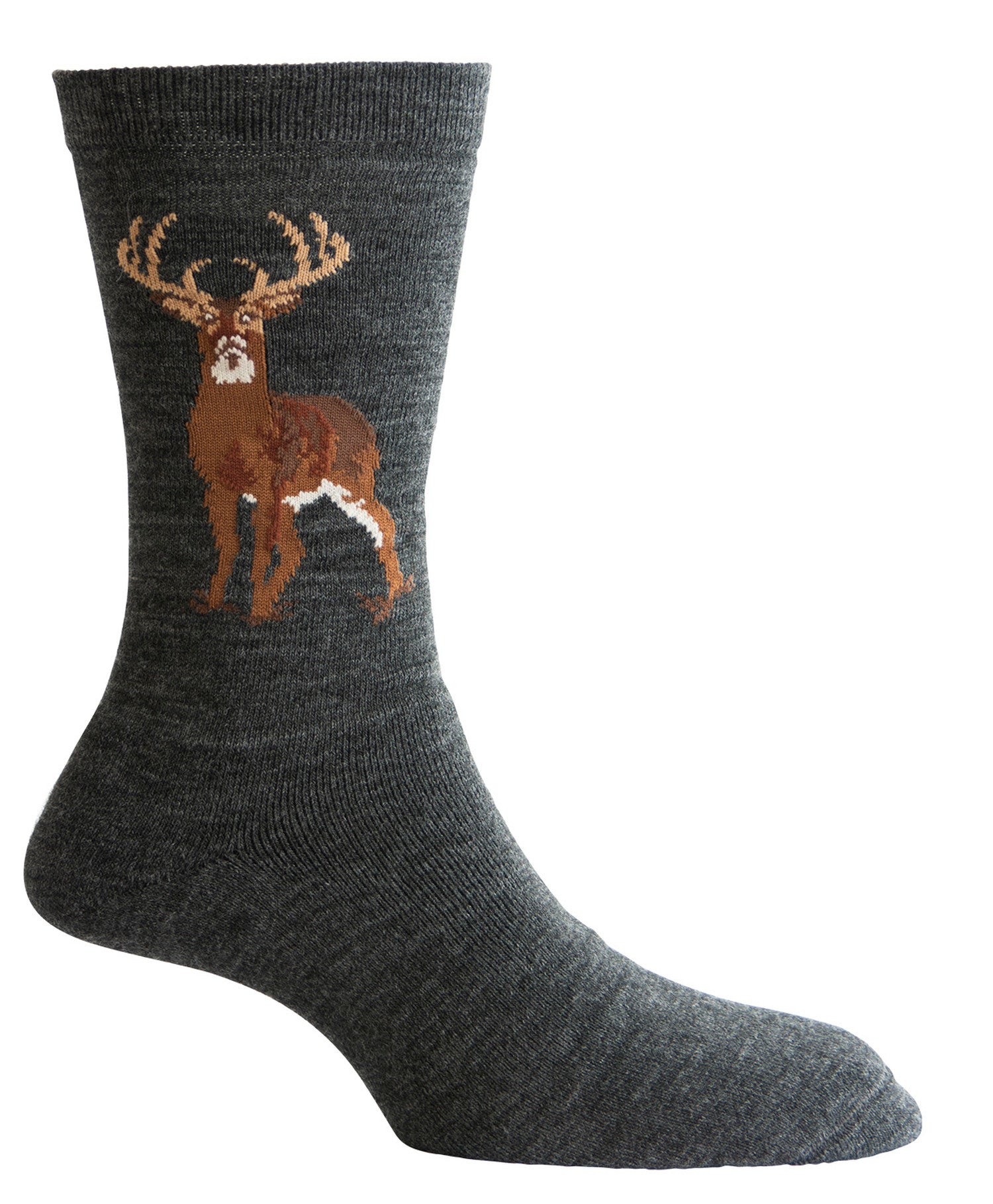 Tynne, glattstrikkete ullsokker med et mønster av en hjort på anklene.