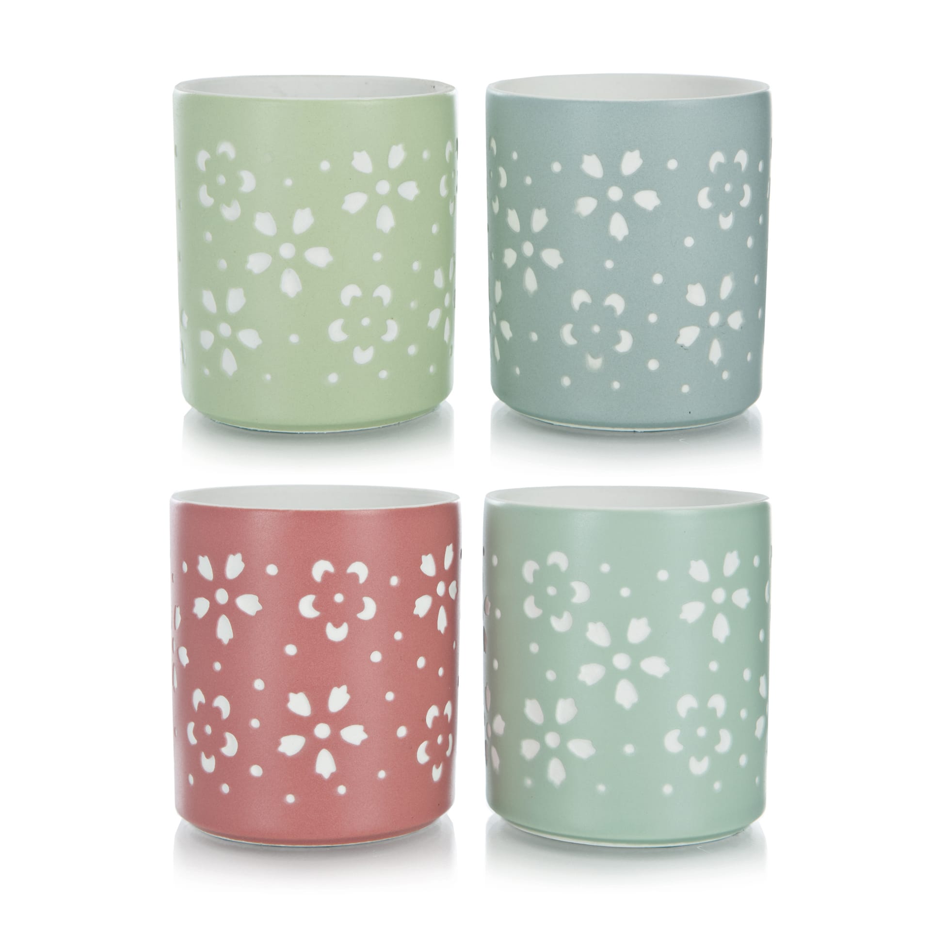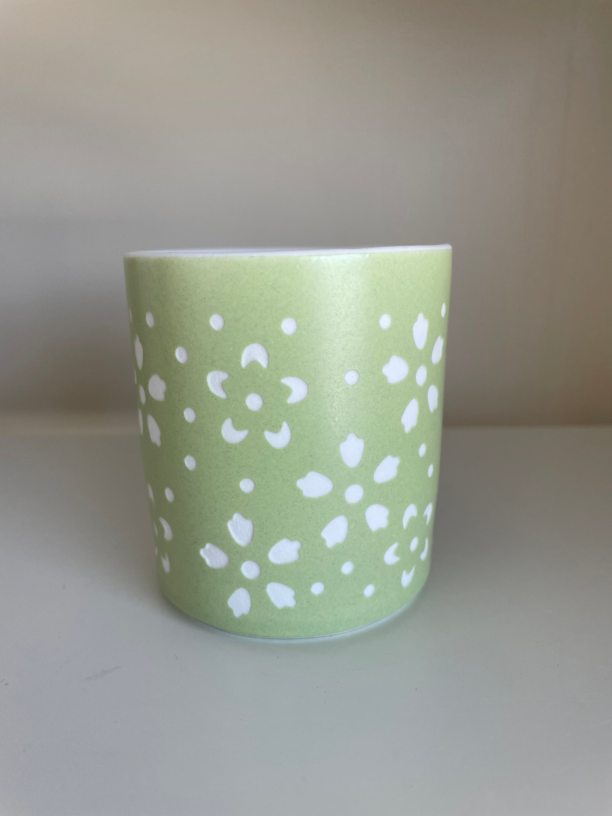 Telysglass m/ blomsterdekor. Farge: Lys grønn